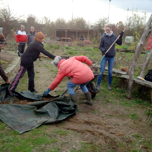 Der Reiterhof Kronsberg hatte ein perfektes Geschenk für uns: Pferdemist! Die meisten Beete sind abgeerntet und sollen vor dem Winter gedüngt werden. In einer samstäglichen Großaktion verteilten wir den Mist auf den Beeten und gruben ihn grob in die obere Bodenschicht ein.