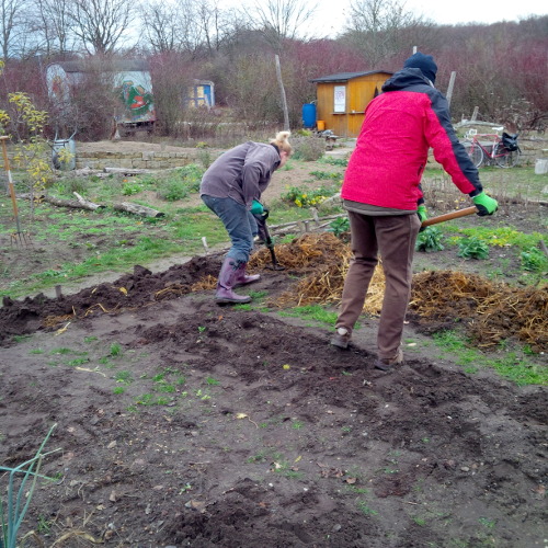 Das hat drei Wirkungen: Erstens graben wir Beikräuter um die sonst das Beet überwuchern könnten. Zweitens kommt der Dünger komplett in den Boden, wird also nicht vom Regen seitlich hinaus gespült. Drittens soll der Bodenfrost später die groben Krumen in feinere aufsprengen, so dass bis zum Frühjahr ein schön lockerer Boden entsteht.